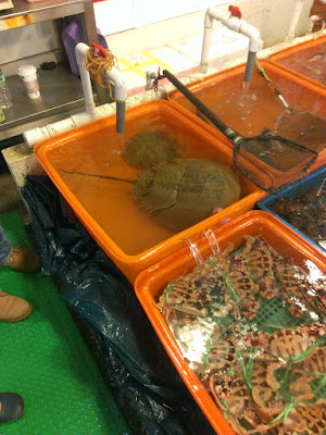 不過店家明知鱟的數量越來越少,我們表明買下來是保育用,還堅持賣給我們這麼貴。一隻母的帶卵7斤多共4000元(一斤550元)!!店家還說,有老師特地買來放生....果然是有交易就有價格!可是真的很捨不得他們被吃掉....這就是鱟一直沒法列為保育類的後果。